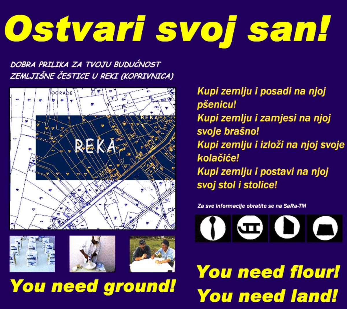 U izložbenoj se inscenaciji isprepliću dvije teme: s jedne strane tema zemlje i složenosti odnosa prema njoj (nemogućnosti preciznog određenja je li prednost imati ili nemati svoje mjesto - dio zemlje, odnosno ostati povezan s mjestom ili zadržati slobodu kretanja, itd.), a s druge strane tema brašna – hrane kao simbola ispunjenja i zadovoljenja osnovne čovjekove potrebe: BITI SIT i zadovoljan... Izložba je realizirana u suradnji sa stanovnicima mjesta Reka kraj Koprivnice, s kojima je autor razgovarao o pitanjima povezanosti osobne identifikacije i toposa, o potrebi posjedovanja zemlje i ideološkog konteksta koji ta tema neminovno zahvaća, kao i složenih tema koje se tiču tradicije i snalaženja u novonastalim uvjetima. U simboličkom izlaganju kolačića na zemlji/travi paradoksalno se zatvara krug ciklusa jednog kretanja u koje je, u vrijeme interkontinentalnih veza, televizije i procesa globalizacije, uključen smisao arhetipskog odnosa prema prirodi i hrani. Stanovnici Reke govore o svom odnosu prema tim temama, evidentirajući dvojstvo egzistencije i njenu prostornu uvjetovanost. Vlasništvo, obilje i oskudica te odnos spram prirode u galerijskoj se inačici nalazi u svojevrsnoj fazi (privremenog) pomirenja.