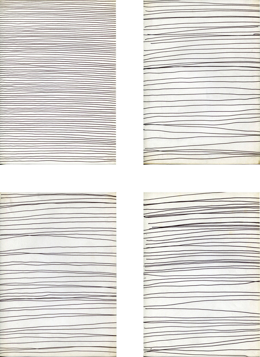 U »Radovima s linijom« taj je postupak doveden do paradigmatske čistoće, do stadija kada se barata krajnje suženim formalnim sredstvima i kada je širina operativnih postupaka bitno reducirana. Međutim i pokraj takve »redukcionističke« varijante slikarskog/crtačkog postupka moguće je zamijeniti vrlo jasnu širinu formulacija metoda i radnih zadataka: od namjere da se međusobnim odnosima linija određuje »struktura« površine papira, preko ispitivanja odnosa linije i veličine podloge do problematiziranja interakcije manuelnog čina i mentalnog postupka, rada i disanja ili prostorne kauzalnosti radnog procesa. Prema tome, bez obzira na suženi formalni izbor, na interno nametnute propozicije i na »siromašni« rezultat radova izvedenih tim postupkom ni u kojem slučaju ne nose jednoznačnu, stereotipnu formulu kakvu je otkrivala tradicionalna kritika. Pretendirajući ne samo na područje samoispitivanja medija slikarstva, dakle, ne uključujući u razmatranje samo lingvističku komponentu djela nego zahvaćajući i područje socijalne problematike (preko ispitivanja vrijednosti djela u nametnutom sistemu njegovog vrednovanja gdje su presudni manuelno-zanatski, vremenski i tzv. estetički kriteriji) Molnarovi radovi i radovi slične strukture u ostalih predstavnika alternativne umjetničke prakse činili su onaj odmak od etablirane kulturne i umjetničke situacije koji nije mogao nastajati kao čin avangardističke rezignacije nego je, naprotiv, svijesni stav prema dominantnim društvenim i kulturnim vrijednostim a bio, kako na jednom mjestu i Molnar kaže »pretpostavka na kojoj se temeljila konstitucija samog rada«.