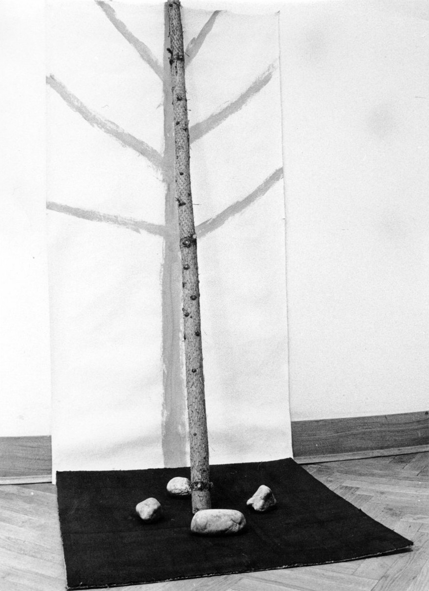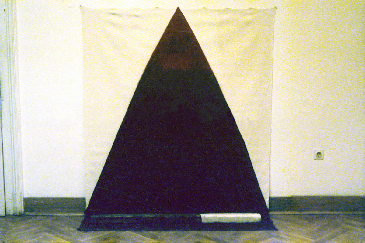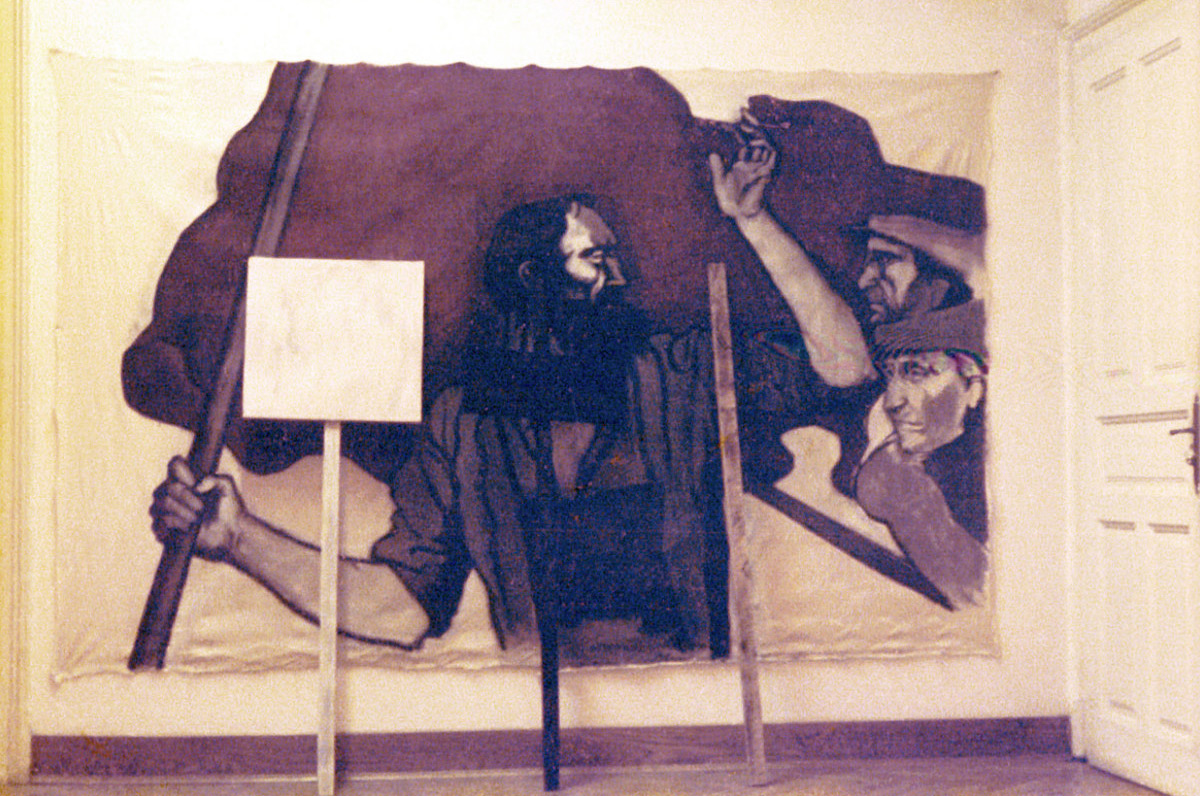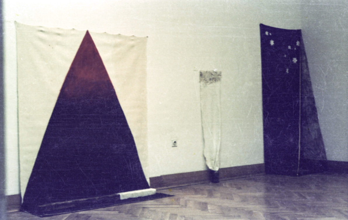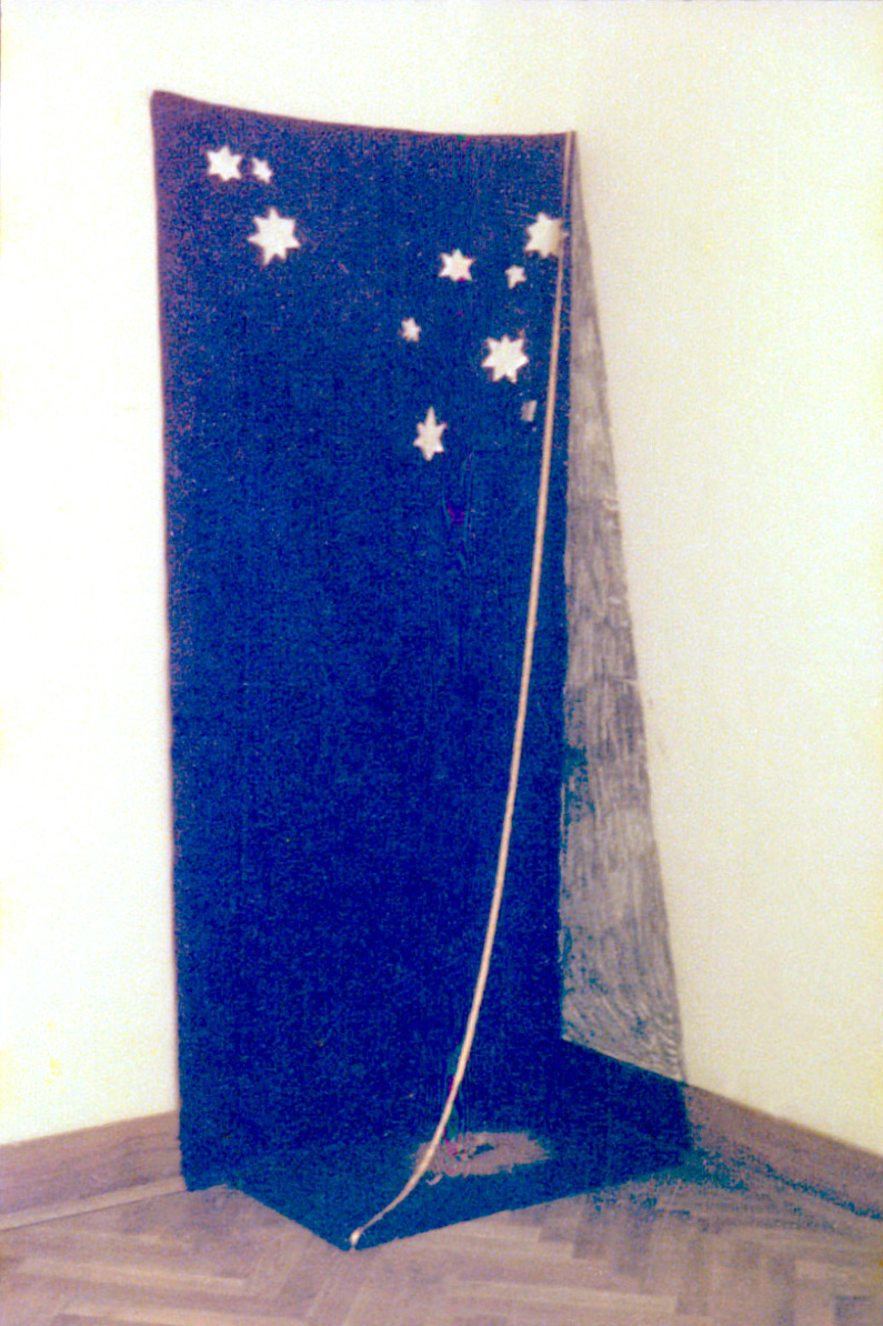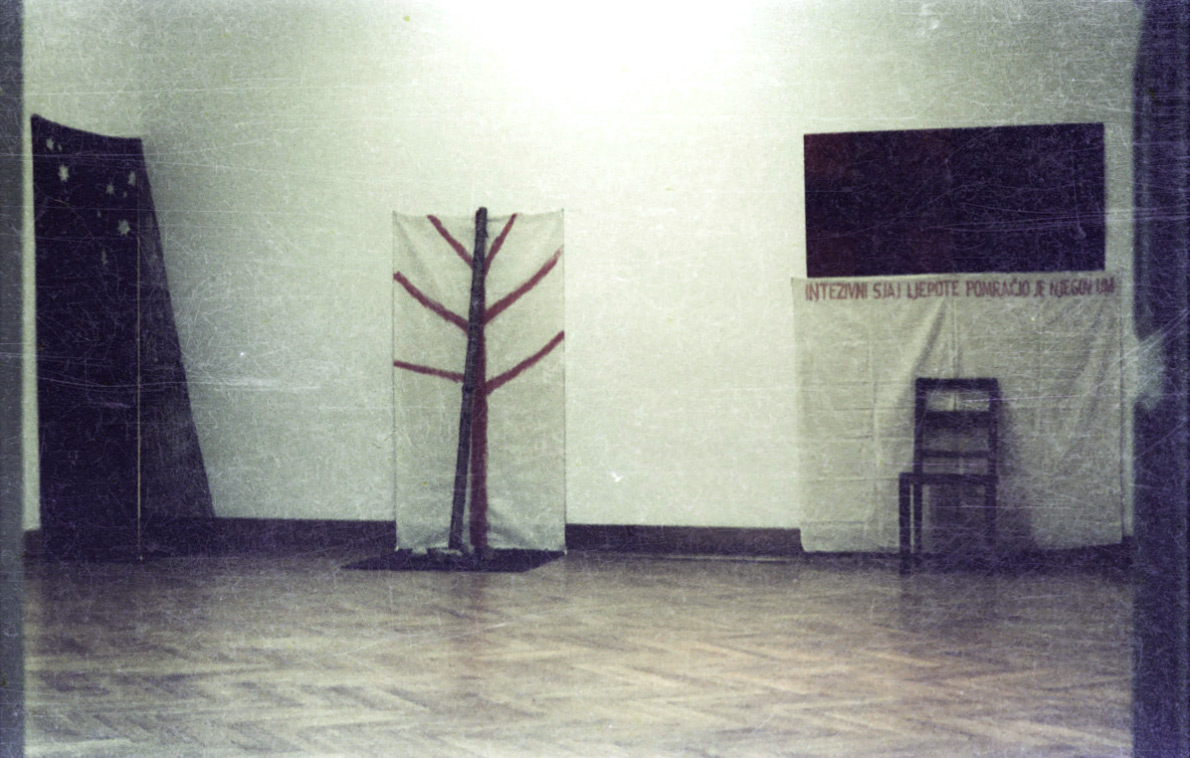 Instalacija, kombinirana tehnika (akril na kartonu, platno, stolica), 1982/93.
