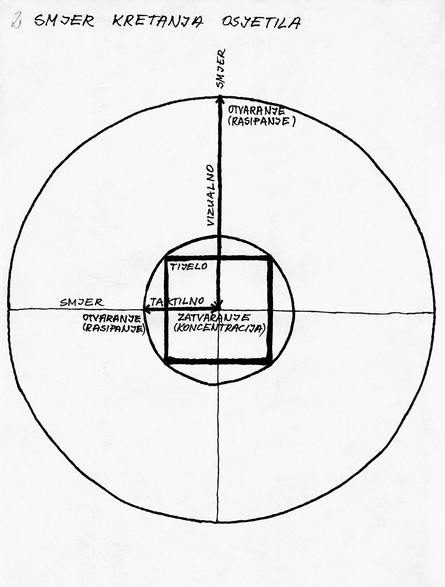 Osjetilna područja: vizualno i taktilno, sa svojim specifičnostima, znakovi su za dva nivoa odnosa prema okolini I prostoru. Taktilan, kao neposredniji odnos povezan je sa "animalnim", potsvjesnim. Vizualan odnos kao posredan, povezan je sa racionalnim.