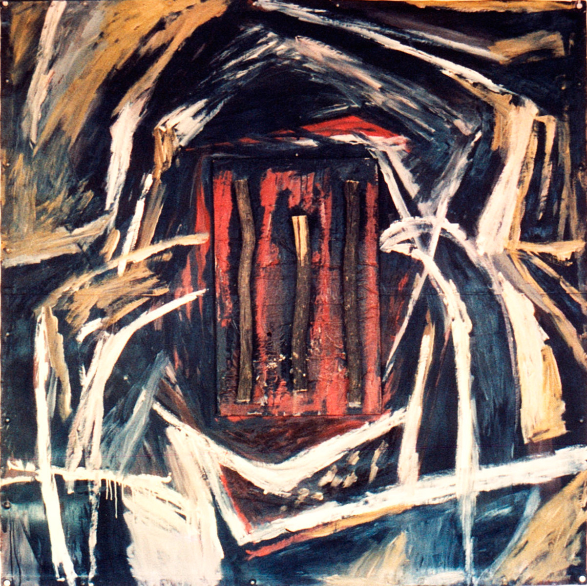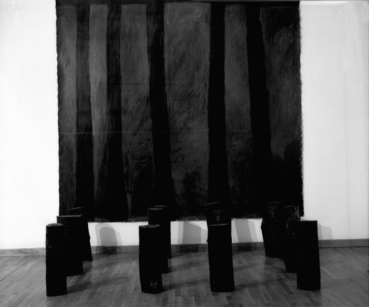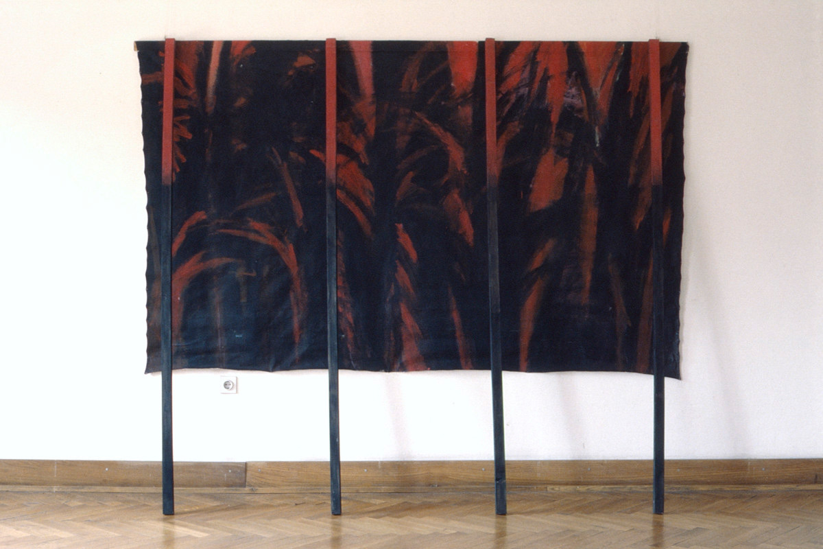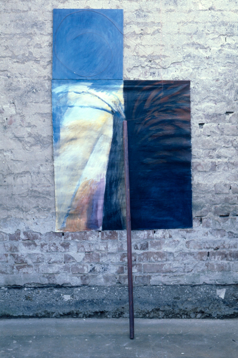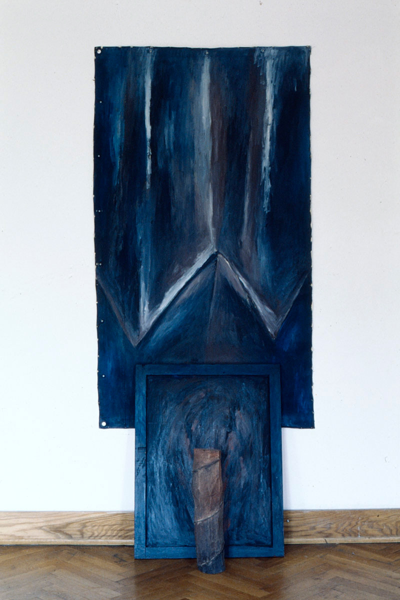 Instalacija, drvo, tempera i kolaž na lesonitu, 230 × 440 cm, 1985.