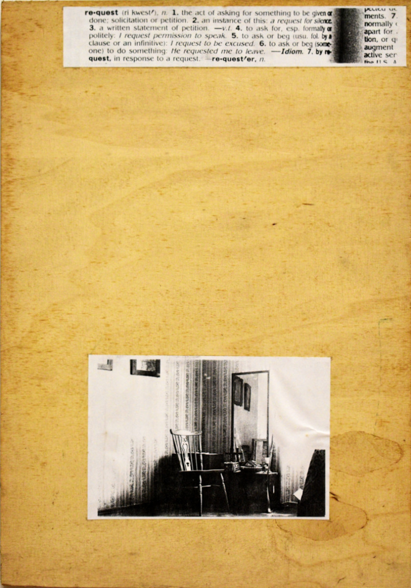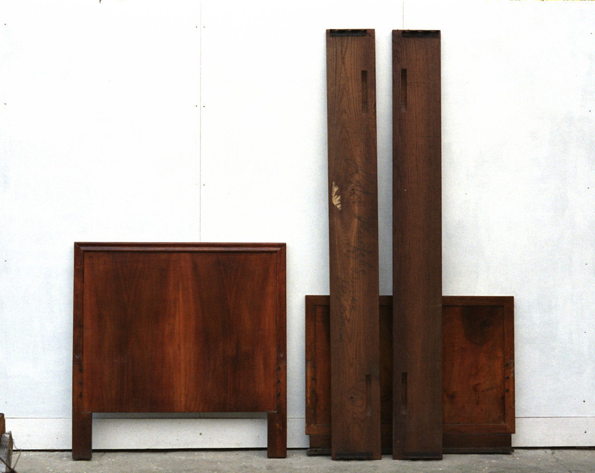 Rastavljene strane kreveta, drvene ploće, aplicirani printani tekst sa fotogrtafijama na papiru