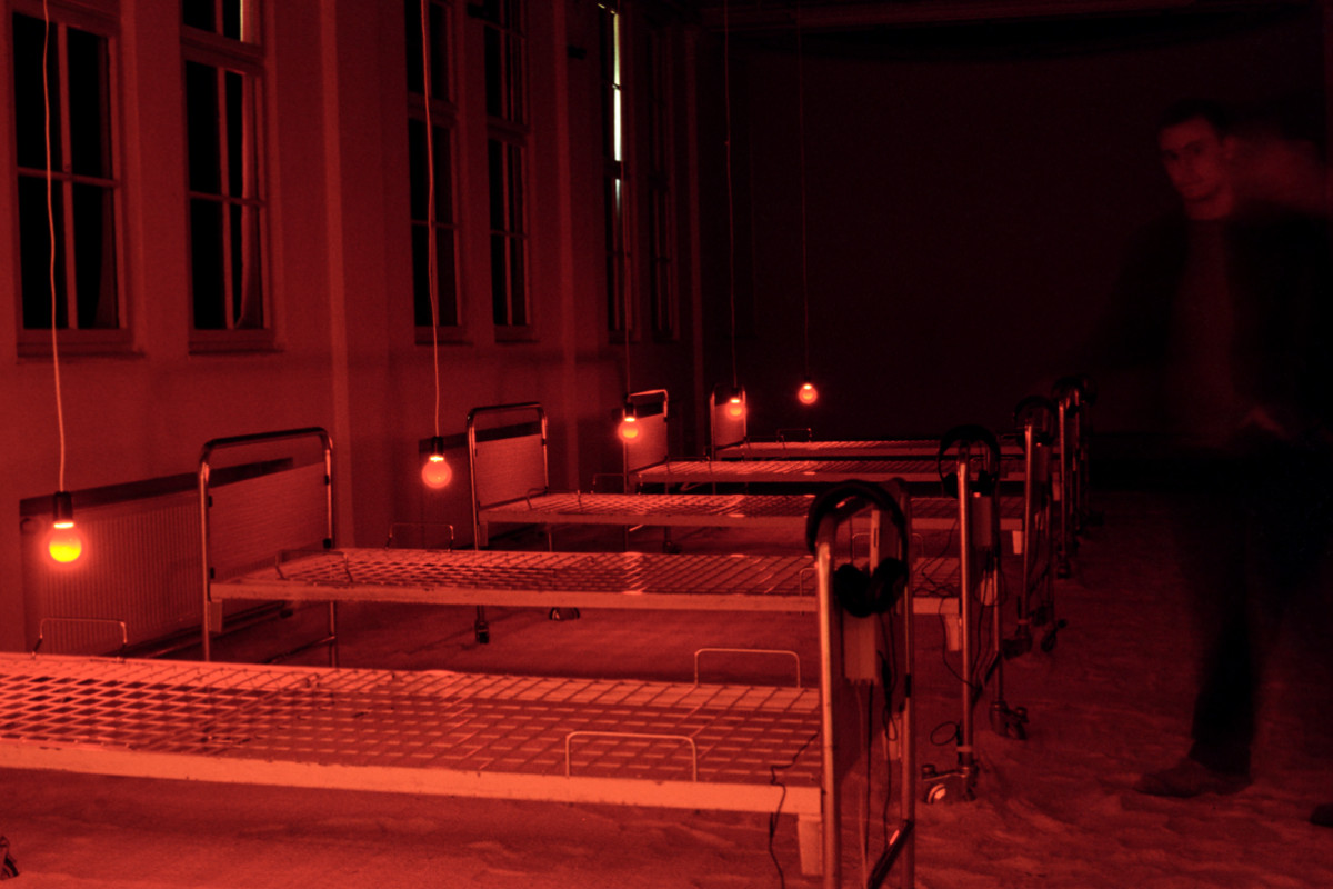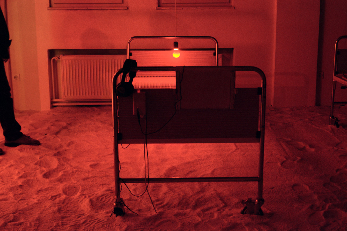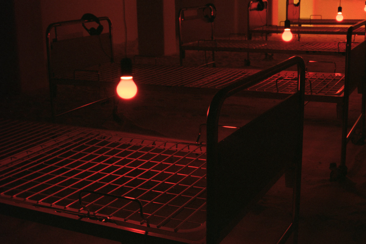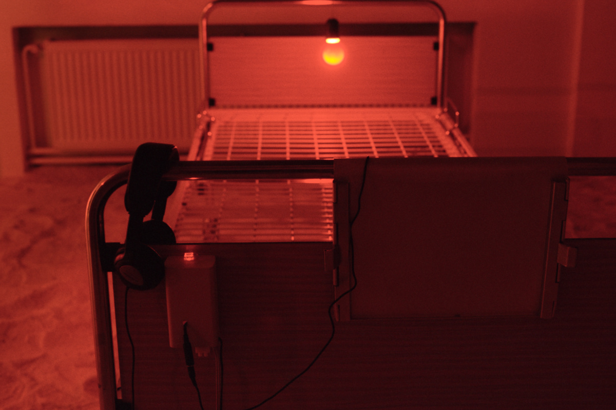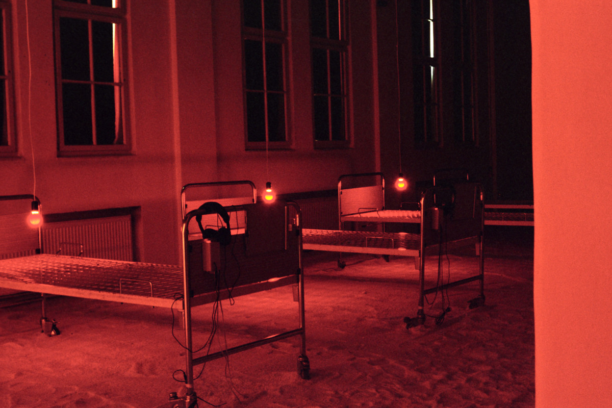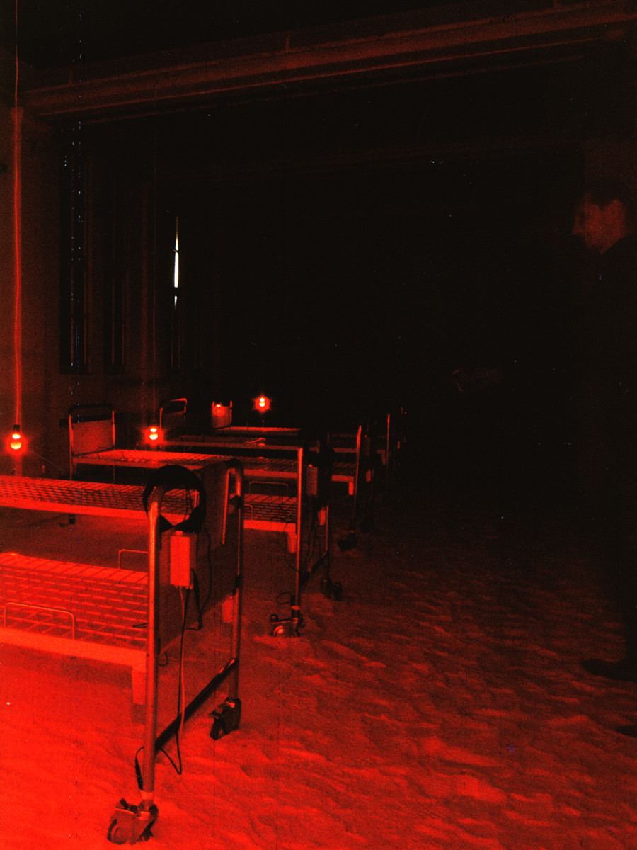 Instalacija-ambijent. Sol, bolnički kreveti, crvene svjetiljke sa senzorima, slušalice