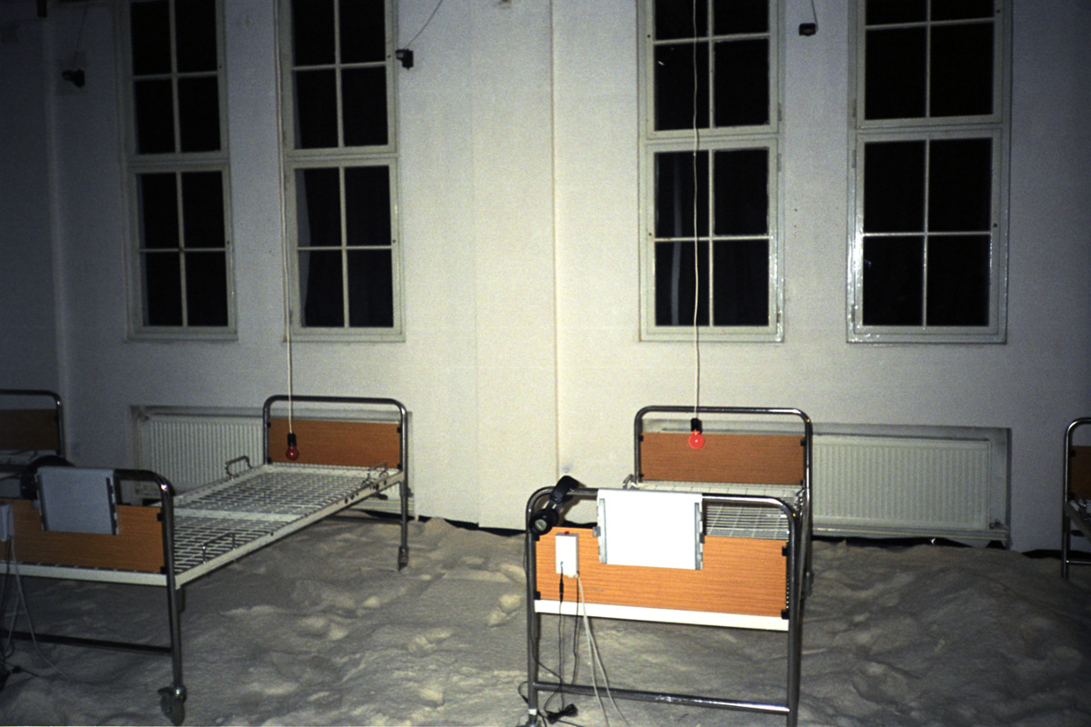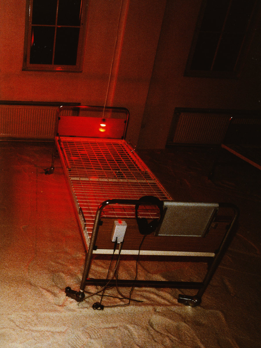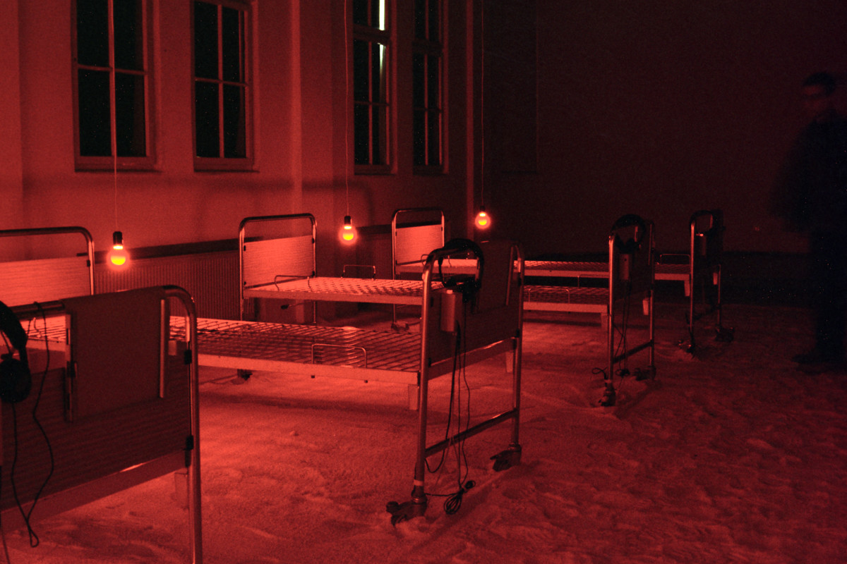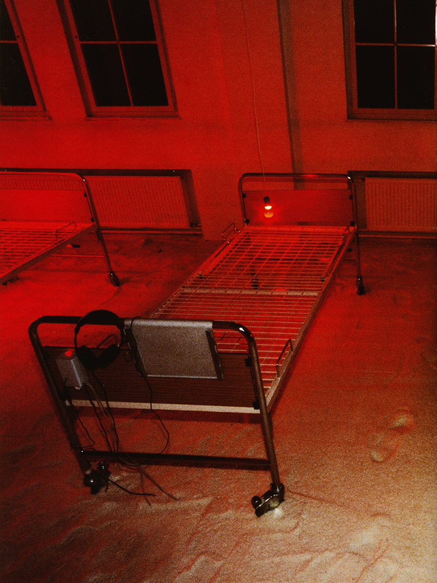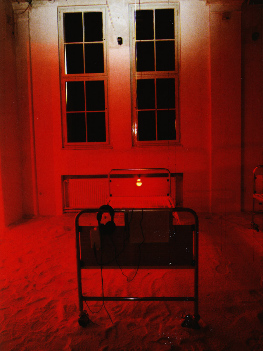 Instalacija-ambijent. Sol, bolnički kreveti, crvene svjetiljke sa senzorima, slušalice