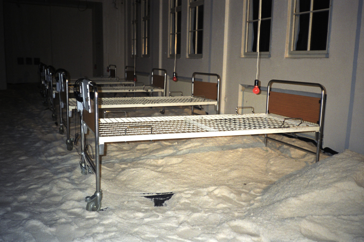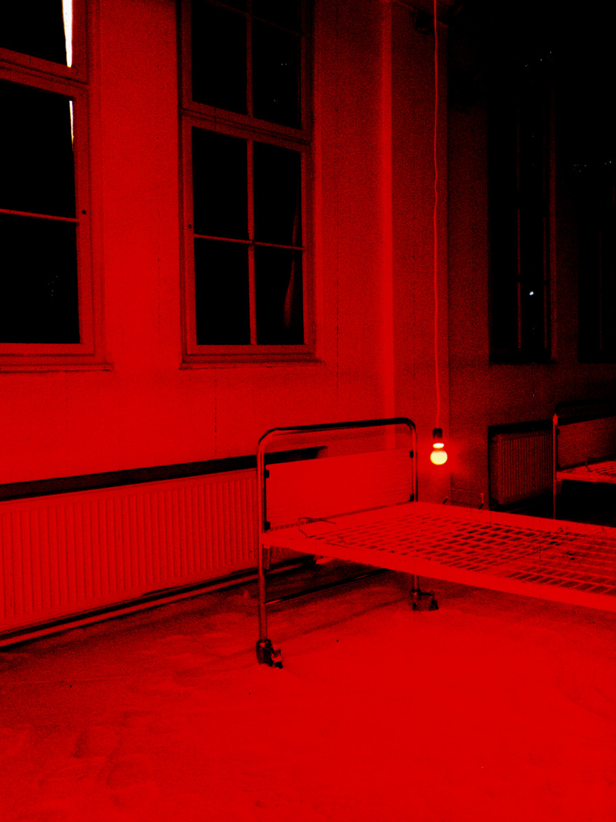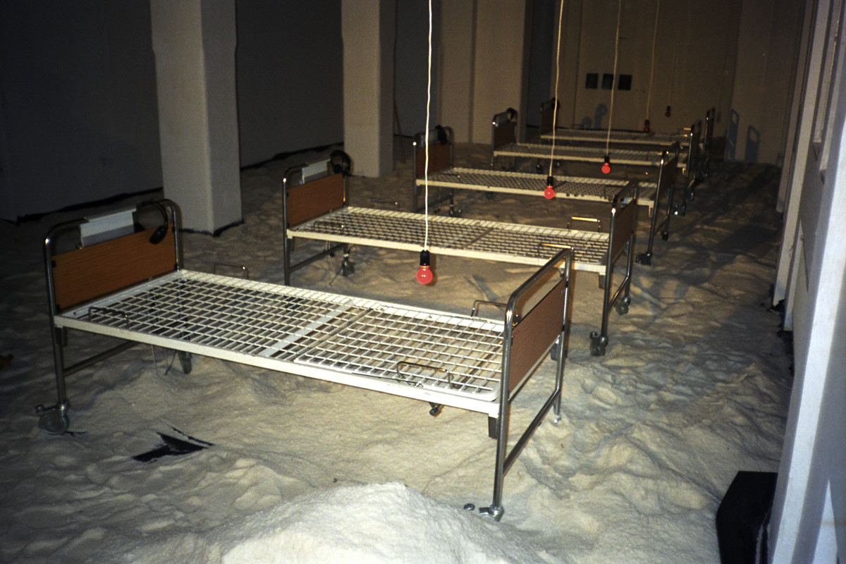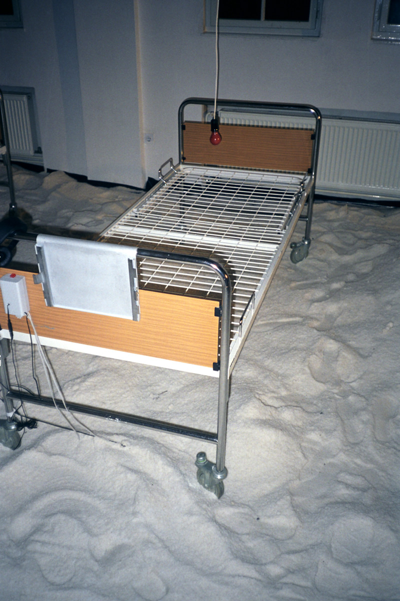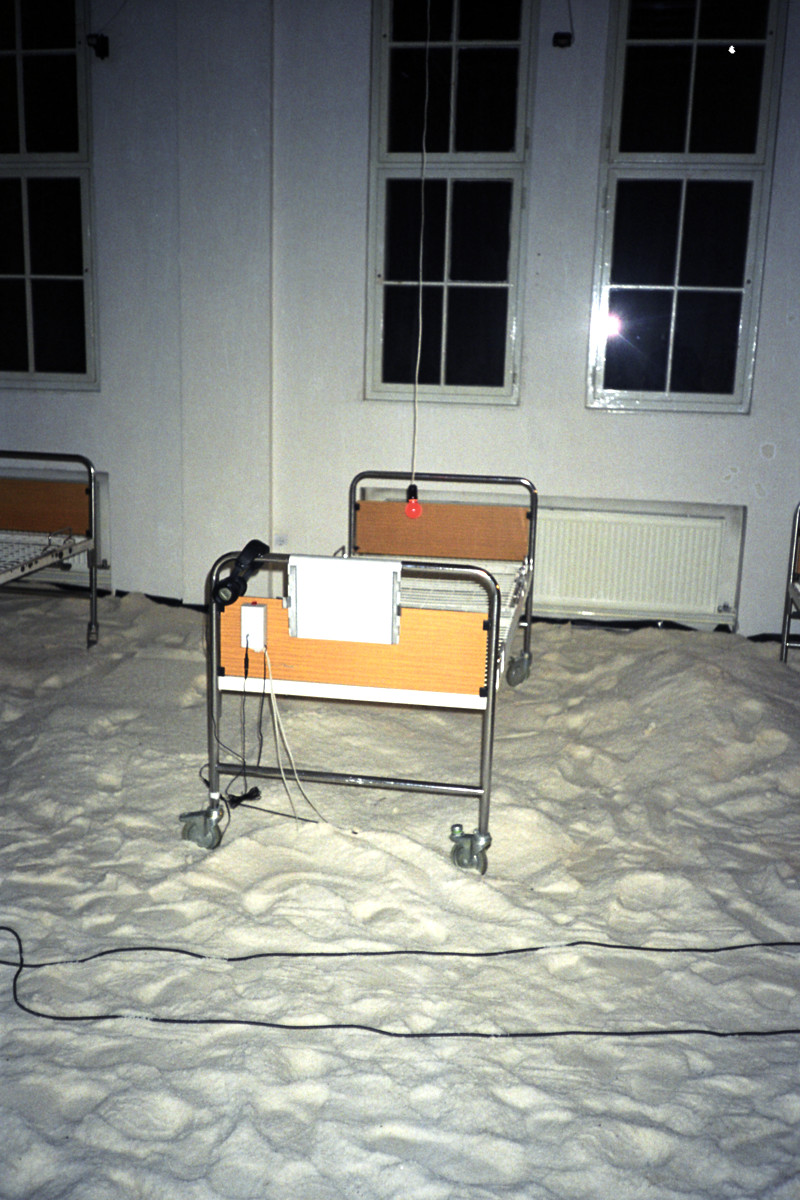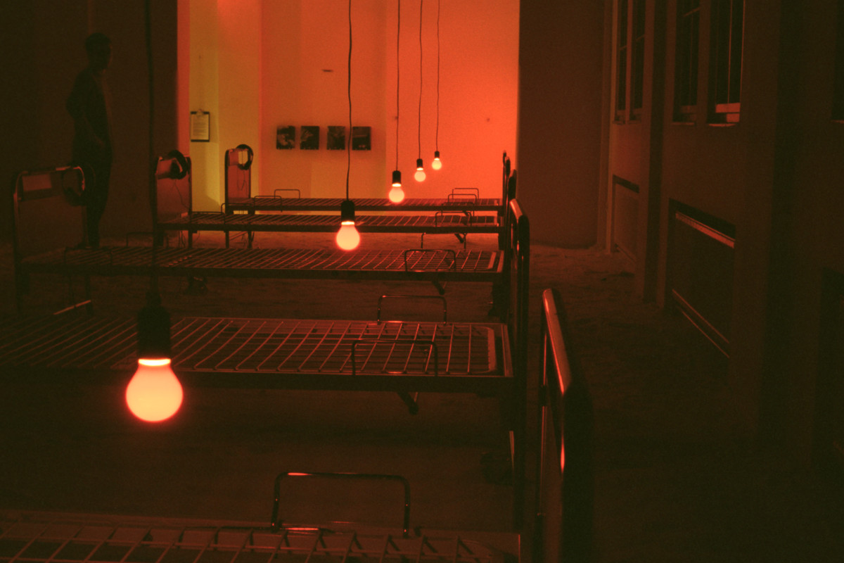 Instalacija-ambijent. Sol, bolnički kreveti, crvene svjetiljke sa senzorima, slušalice