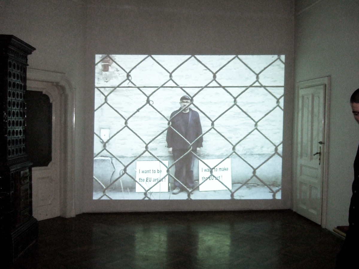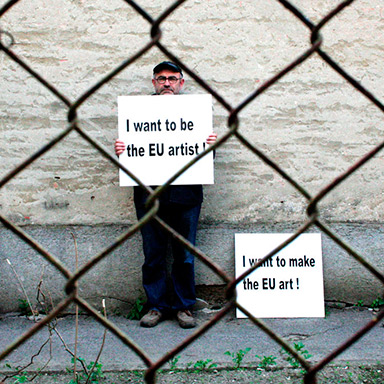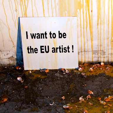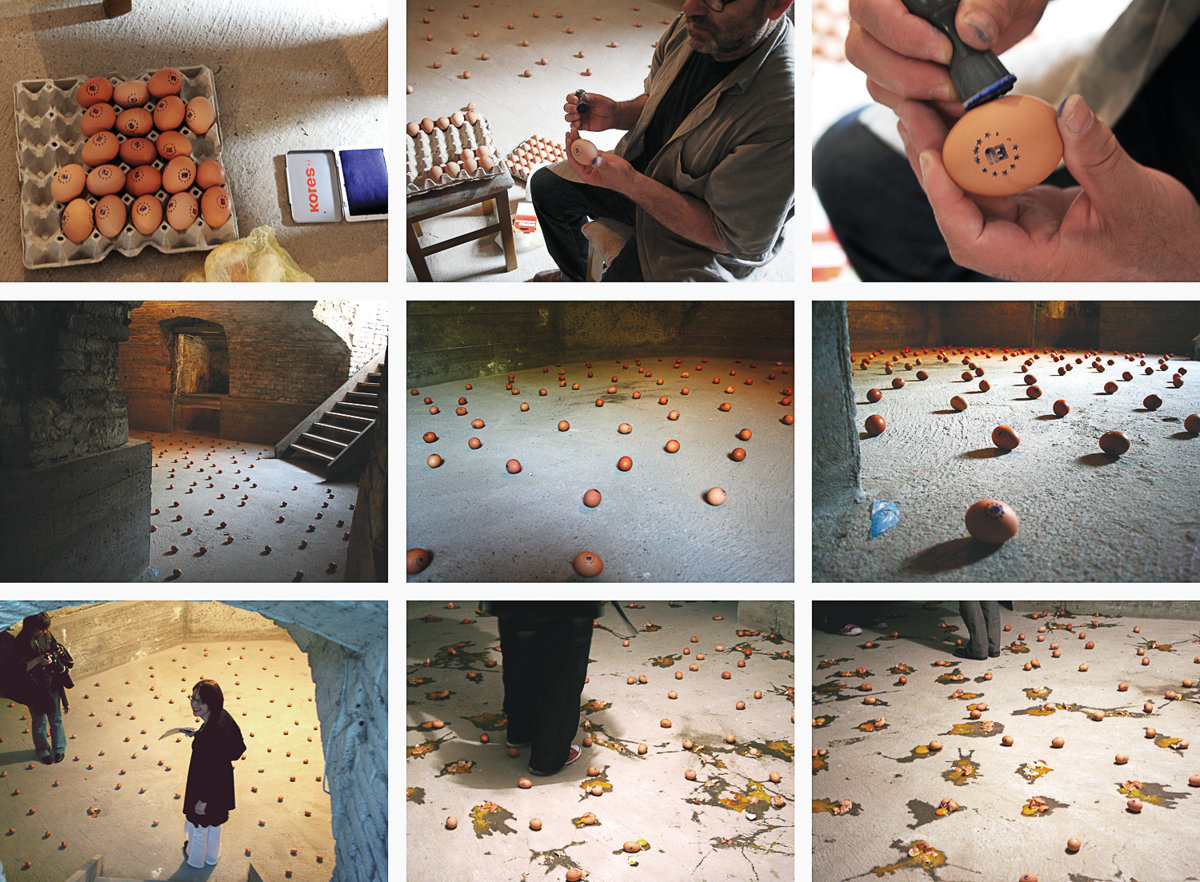 Dva rada koja su međusobno povezana, jedan je instalacija a drugi je performans. Povezuju ih jaja. Kod instalacije "Hodanje po jajima" jaja su postavljena na pod prostora kroz koji moraju proći posjetitelji. Ona su obilježana vidljivim logom/ EU znakom i zastavicom. Kod performansa jaja služe za gađanje umjetnika i to u trenutku kad on podiže, naizmjence, dva transparenta. Jedan na kojem piše: Želim stvarati EU umjetnost i drugi na kojem piše: Želim biti EU umjetnik.