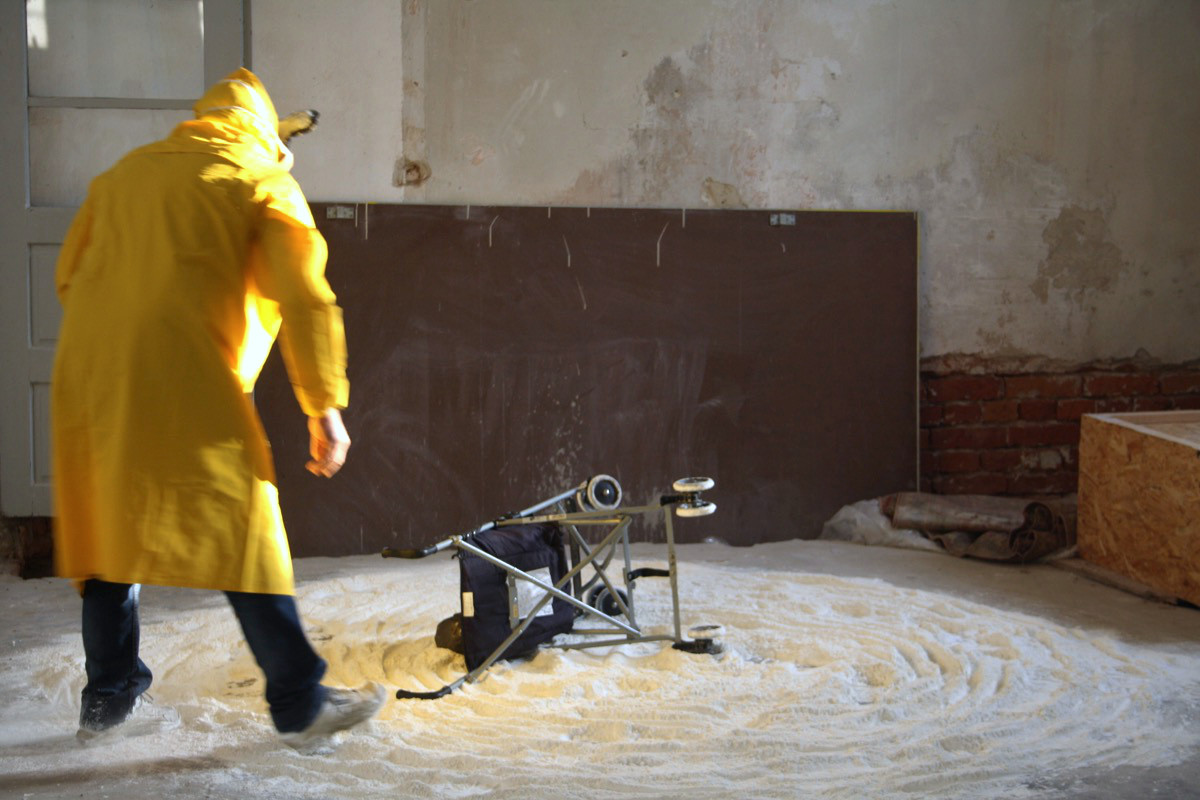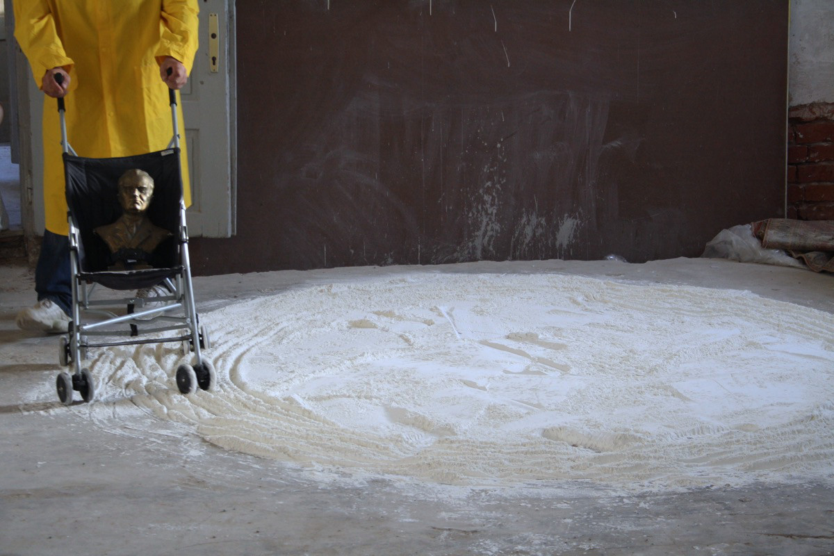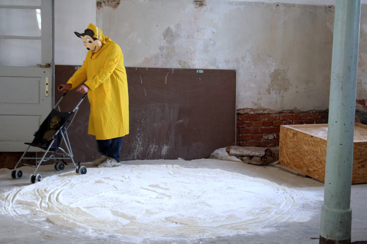U izvedbi performansa koristio sam žutu kabanicu, masku Miki Mausa, brašno, dječja kolica i bistu Josipa Broza Tita. Ulazim u prostor u kojem se nalazi brašno na podu formirano u krug na čijem rubu se nalaze dječja kolica sa bistom Tita. Okrećem kolica i guram ih rubom formiranog brašna u smjeru koji je obrnut kretanju kazaljke na satu. Kretanjem smanjujem krug i približavam se centru tog kruga u kojem prevrćem kolica sa bistom i izlazim iz kruga.