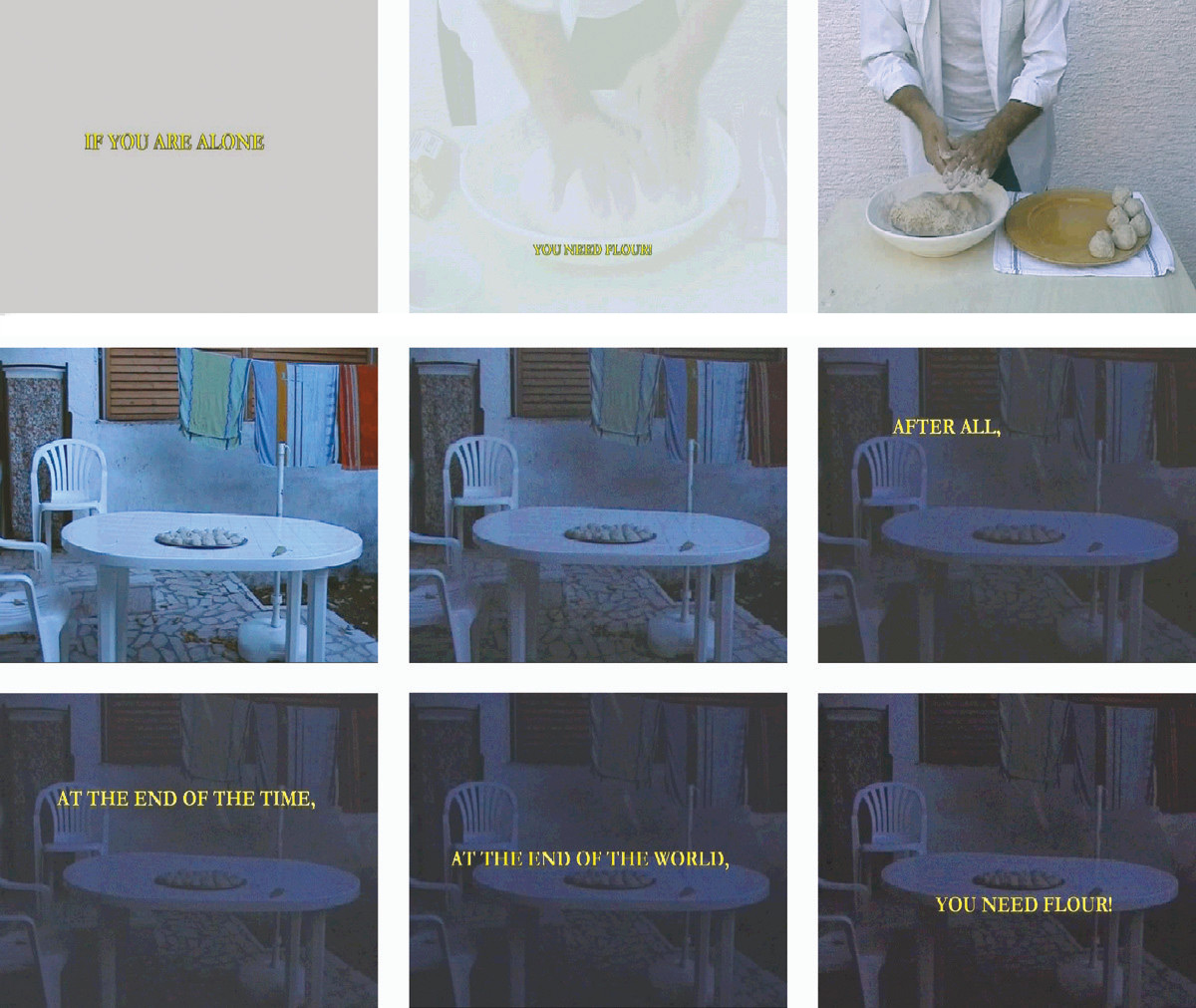 Ovaj rad, prikazan u Galeriji Marino Cetina u Umagu 2004, pripada seriji radova s brašnom ("Između šume i brašna", Koprivnica, 2001, "You Need Help ili hranite ptice", Rijeka, 2003, "You Need Ground", Zagreb, 2003). U njima u različitim kontekstima koristim brašno kao materijal organskog karaktera, proizvoda zemlje, sirovine masovnog prehrambenog artikla – kruha. On je također fin prah koji u spoju s vodom mijenja karakter.